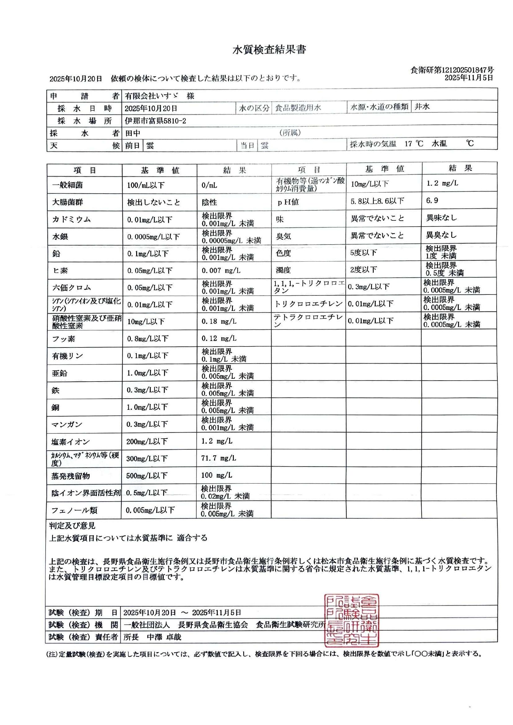 2025年度水質検査を実施致しましたので下記の通り結果報告させて頂きます。